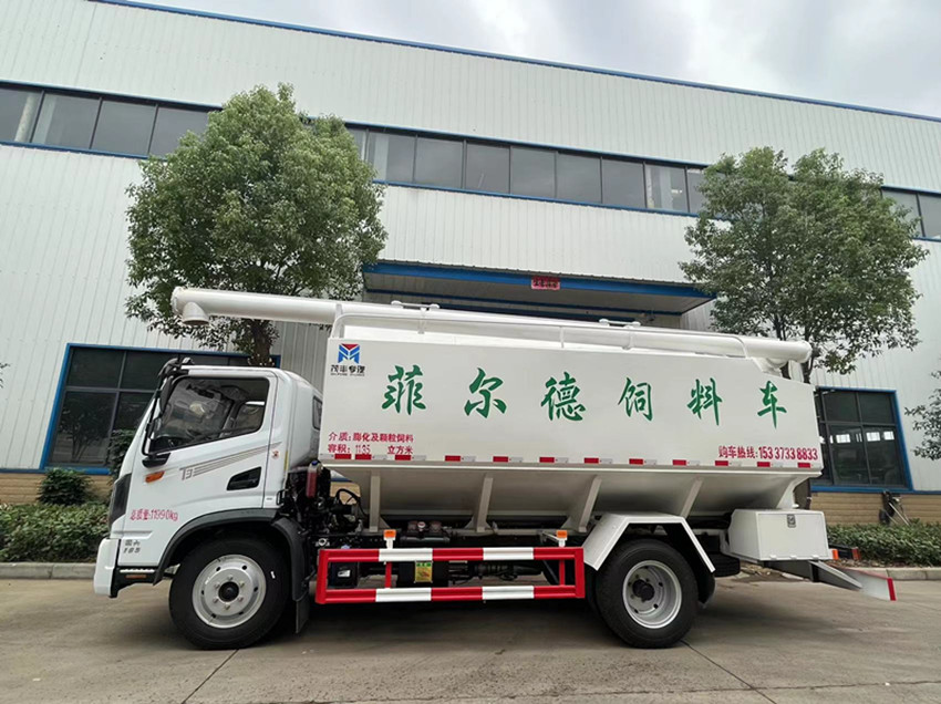 散裝飼料運(yùn)輸車,散裝飼料車的飼料罐架設(shè)在卡車的底盤上,罐頂開有進(jìn)料口.頂部的一根螺旋輸送卸料管(俗稱卸料絞龍)則可自由回轉(zhuǎn)和抬升,抬升的仰角可達(dá)60度。運(yùn)輸時(shí),頂部的螺旋管平臥在罐頂;卸料時(shí)則抬起,使管端的出料口與畜禽飼養(yǎng)場(chǎng)貯料罐頂部的進(jìn)料門相接,駕駛室內(nèi)裝有操縱裝置(操縱裝置也可裝置在罐體尾部),卸料時(shí)通過(guò)車底的動(dòng)力輸出軸和減速器來(lái)驅(qū)動(dòng)螺旋,以完成卸料。