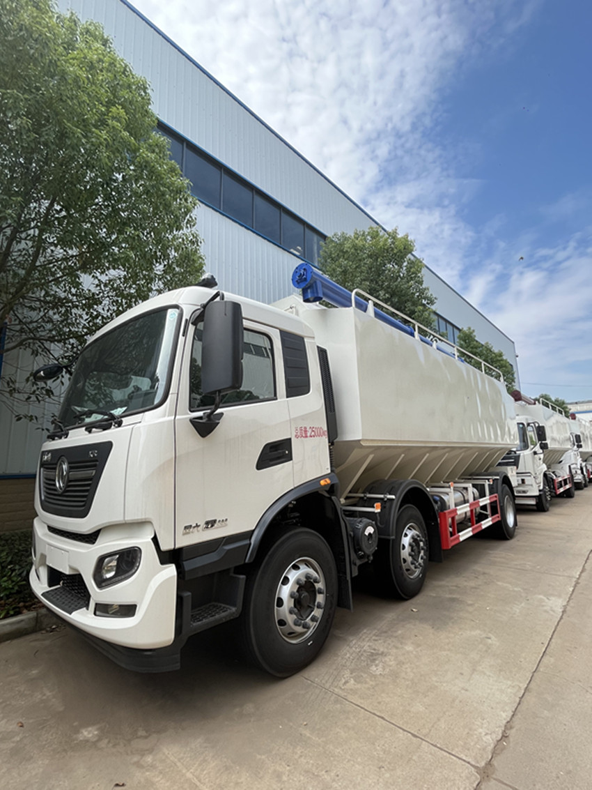 散裝飼料運(yùn)輸車,散裝飼料車的飼料罐架設(shè)在卡車的底盤上,罐頂開有進(jìn)料口.頂部的一根螺旋輸送卸料管(俗稱卸料絞龍)則可自由回轉(zhuǎn)和抬升,抬升的仰角可達(dá)60度。運(yùn)輸時(shí),頂部的螺旋管平臥在罐頂;卸料時(shí)則抬起,使管端的出料口與畜禽飼養(yǎng)場(chǎng)貯料罐頂部的進(jìn)料門相接,駕駛室內(nèi)裝有操縱裝置(操縱裝置也可裝置在罐體尾部),卸料時(shí)通過車底的動(dòng)力輸出軸和減速器來驅(qū)動(dòng)螺旋,以完成卸料。