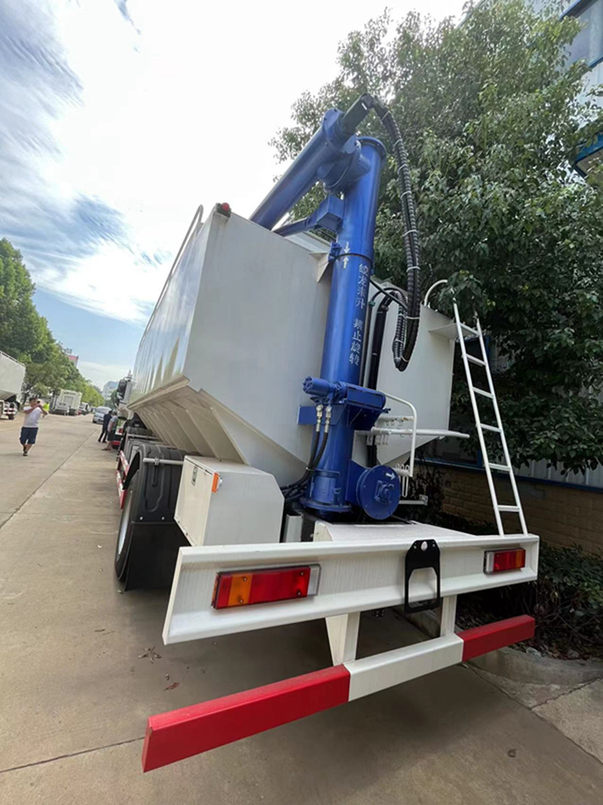 散裝飼料運(yùn)輸車,散裝飼料車的飼料罐架設(shè)在卡車的底盤(pán)上,罐頂開(kāi)有進(jìn)料口.頂部的一根螺旋輸送卸料管(俗稱卸料絞龍)則可自由回轉(zhuǎn)和抬升,抬升的仰角可達(dá)60度。運(yùn)輸時(shí),頂部的螺旋管平臥在罐頂;卸料時(shí)則抬起,使管端的出料口與畜禽飼養(yǎng)場(chǎng)貯料罐頂部的進(jìn)料門(mén)相接,駕駛室內(nèi)裝有操縱裝置(操縱裝置也可裝置在罐體尾部),卸料時(shí)通過(guò)車底的動(dòng)力輸出軸和減速器來(lái)驅(qū)動(dòng)螺旋,以完成卸料。