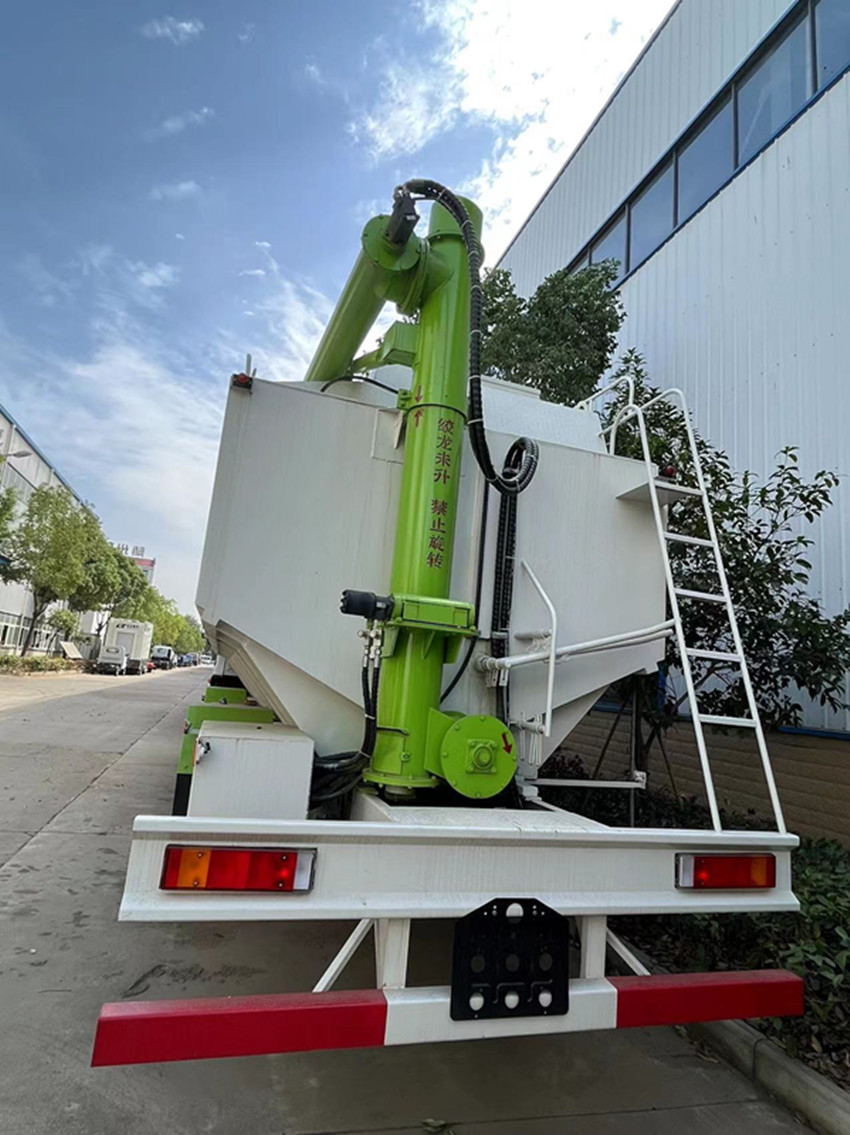 散裝飼料運(yùn)輸車,散裝飼料車的飼料罐架設(shè)在卡車的底盤上,罐頂開有進(jìn)料口.頂部的一根螺旋輸送卸料管(俗稱卸料絞龍)則可自由回轉(zhuǎn)和抬升,抬升的仰角可達(dá)60度。運(yùn)輸時(shí),頂部的螺旋管平臥在罐頂;卸料時(shí)則抬起,使管端的出料口與畜禽飼養(yǎng)場(chǎng)貯料罐頂部的進(jìn)料門相接,駕駛室內(nèi)裝有操縱裝置(操縱裝置也可裝置在罐體尾部),卸料時(shí)通過車底的動(dòng)力輸出軸和減速器來(lái)驅(qū)動(dòng)螺旋,以完成卸料。