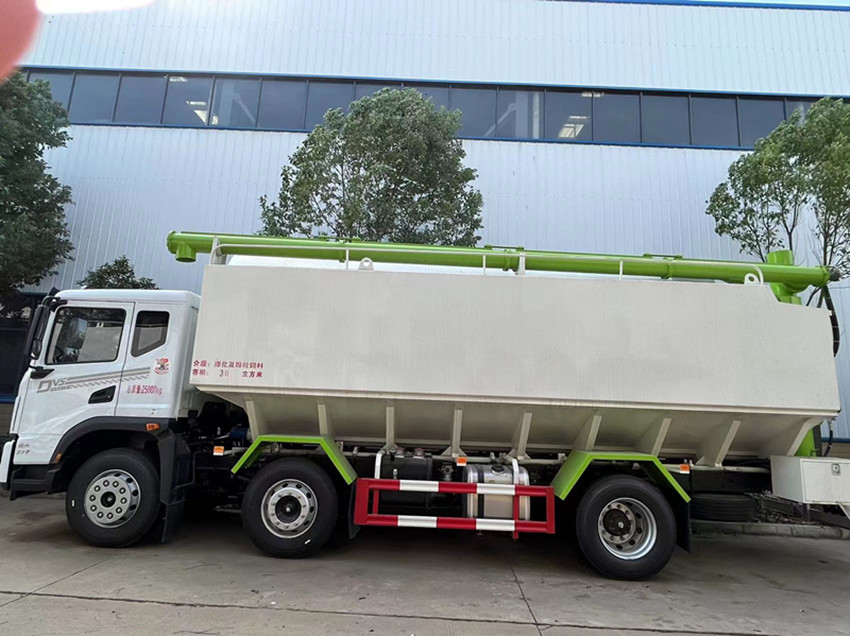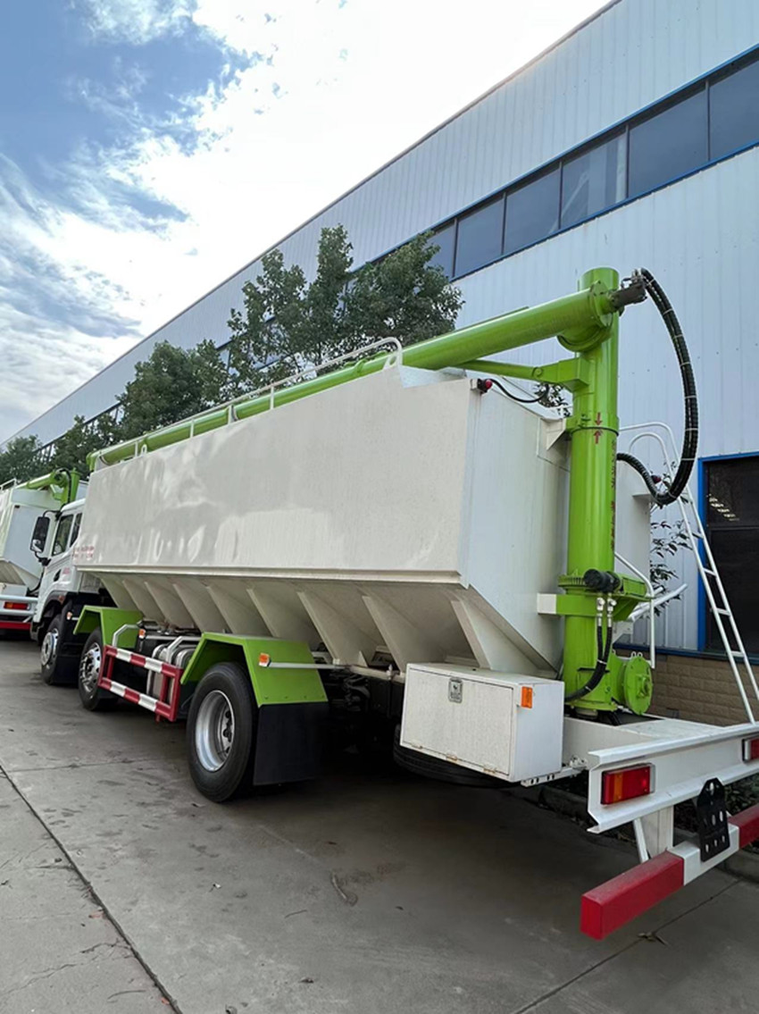 散裝飼料運(yùn)輸車,散裝飼料車的飼料罐架設(shè)在卡車的底盤上,罐頂開有進(jìn)料口.頂部的一根螺旋輸送卸料管(俗稱卸料絞龍)則可自由回轉(zhuǎn)和抬升,抬升的仰角可達(dá)60度。運(yùn)輸時,頂部的螺旋管平臥在罐頂;卸料時則抬起,使管端的出料口與畜禽飼養(yǎng)場貯料罐頂部的進(jìn)料門相接,駕駛室內(nèi)裝有操縱裝置(操縱裝置也可裝置在罐體尾部),卸料時通過車底的動力輸出軸和減速器來驅(qū)動螺旋,以完成卸料。