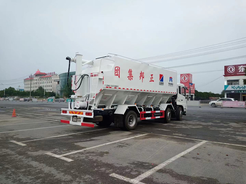 散裝飼料運輸車,散裝飼料車的飼料罐架設(shè)在卡車的底盤上,罐頂開有進料口.頂部的一根螺旋輸送卸料管(俗稱卸料絞龍)則可自由回轉(zhuǎn)和抬升,抬升的仰角可達60度。運輸時,頂部的螺旋管平臥在罐頂;卸料時則抬起,使管端的出料口與畜禽飼養(yǎng)場貯料罐頂部的進料門相接,駕駛室內(nèi)裝有操縱裝置(操縱裝置也可裝置在罐體尾部),卸料時通過車底的動力輸出軸和減速器來驅(qū)動螺旋,以完成卸料。