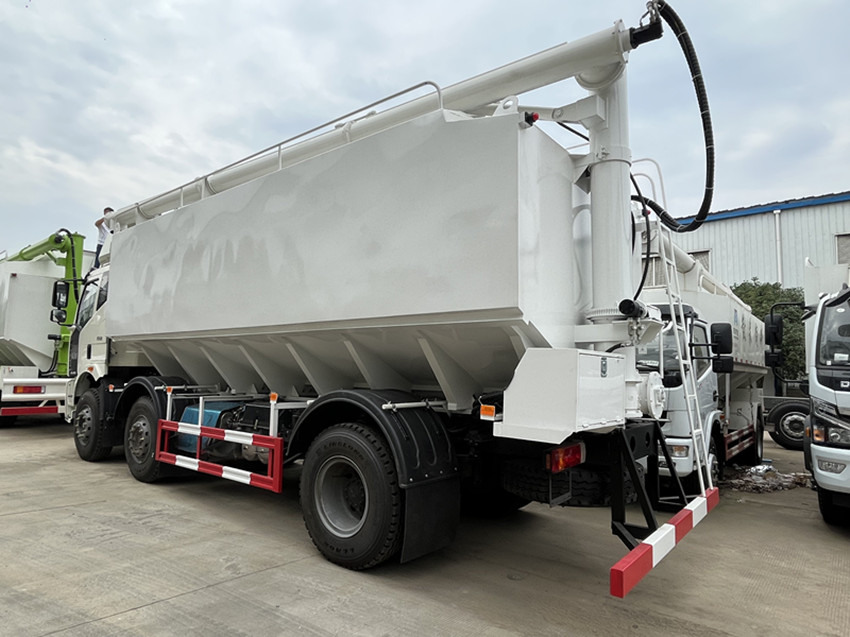 散裝飼料運輸車,散裝飼料車的飼料罐架設(shè)在卡車的底盤上,罐頂開有進料口.頂部的一根螺旋輸送卸料管(俗稱卸料絞龍)則可自由回轉(zhuǎn)和抬升,抬升的仰角可達(dá)60度。運輸時,頂部的螺旋管平臥在罐頂;卸料時則抬起,使管端的出料口與畜禽飼養(yǎng)場貯料罐頂部的進料門相接,駕駛室內(nèi)裝有操縱裝置(操縱裝置也可裝置在罐體尾部),卸料時通過車底的動力輸出軸和減速器來驅(qū)動螺旋,以完成卸料。